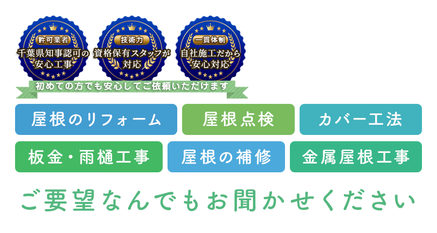 屋根は風雨や雪などから暮らしを守る重要な存在です。同時に常に厳しい外部環境にさらされているため、劣化のスピードが早い側面もございます。創業30年以上の歴史で培ったノウハウと技術やガルバリウムなど多種多様な屋根材を使用し、職人たちが住まいの安心をしっかりと守ります。どんな細かいことや気になる点でもご対応しておりますので、千葉市などで屋根リフォームのご依頼をお考えなら有限会社山之口瓦店にぜひおまかせください。