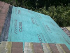 3枚目の写真では、防水シート(ルーフィング)を施工している様子です。 これは屋根の“防水の要”となる大切な工程です。