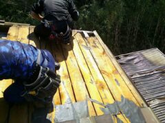 最初の写真では、既存の屋根材をめくった状態が写っています。 野地板が雨水で傷んでおり、黒ずみや腐食が見られます。
